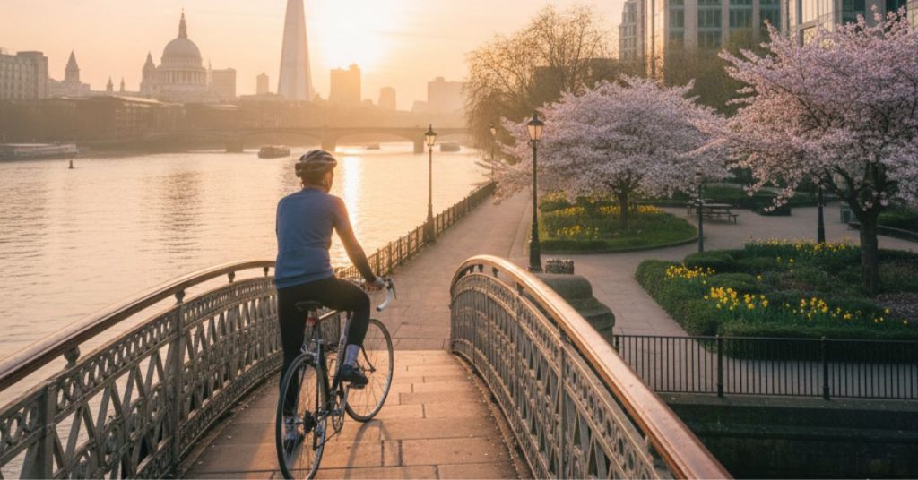 When you cycle, London wakes up. The city’s heartbeat becomes visible: the barista at the corner café turning the ‘open’ sign, the early joggers on the Thames Path, the postman navigating Georgian terraces before the rest of the neighbourhood stirs. You’re no longer isolated in a metal tube underground; you are part of the city’s rhythm. As you pedal, you absorb details that are completely invisible when traveling by car or train. The colours of old brickwork at different times of day. The sudden burst of floral scents from a hidden garden. The echo of church bells bouncing off residential streets. Cycling expands your awareness you don’t just go through London, you meet it.