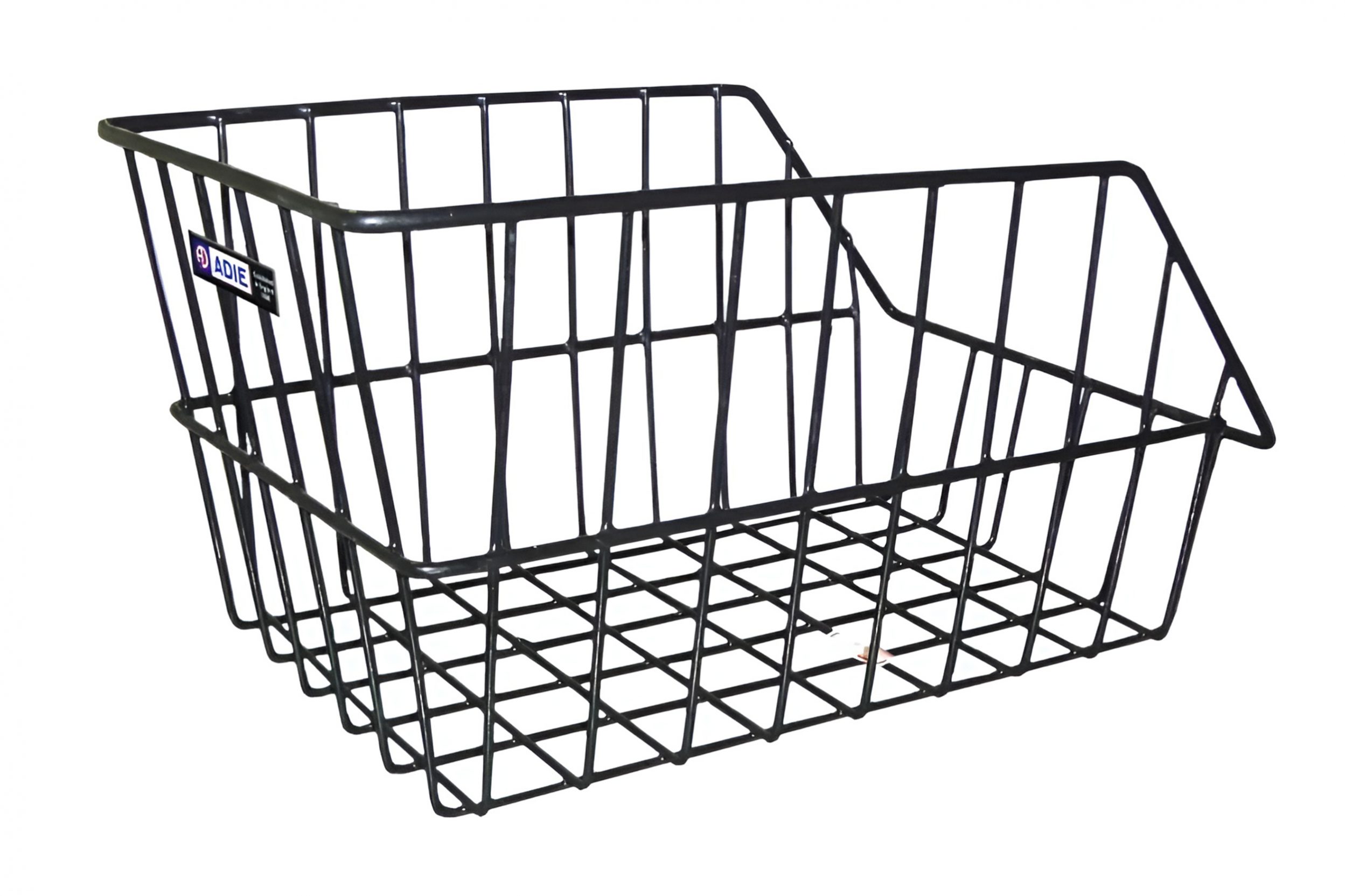 Black metal rear tray basket including two metal fixing plates for attaching to rear pannier rack. Pannier rack not included.